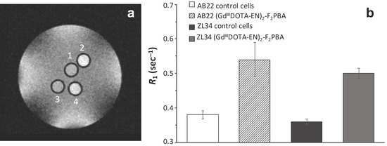 T1W image (TR = 250 ms, TE = 3.8 ms) of a phantom containing glass capillaries filled with AB22 murine mesothelioma cells (control, 1) incubated with 0.6 mM (GdIII-DOTA-EN)2-F2PBA (2) and ZL34 human mesothelioma cells (control, 3) incubated with 0.6 mM (GdIII-DOTA-EN)2-F2PBA (4) (a) and their corresponding values of longitudinal relaxivities (b). Error bars indicate ±SD and the mean values are obtained from three different slices.
