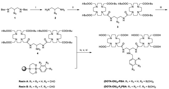 Synthesis of (DOTA-EN)2-PBA and (DOTA-EN)2-F2PBA: (i) 4 M HCl, dioxane, rt, 15 h; (ii) DOTA(Ot-Bu)3, HBTU, HOBt, DIPEA, DMF, rt, 15 h; (iii) H2, Pd/C, rt, 3 h; (iv) THF, rt, 3 h; (v) NaBH4, THF, rt, 4 h; (vi) TFA, DCM, rt, 1 h.