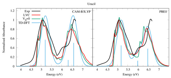 The experimental absorption spectrum of Ura in the vapor phase (at 501 K for the lower energy band, 439 K for the higher energy band, see the caption of Figure 2) exhibits a broad band peaking at ∼5.1 eV (244 nm, band I) with a red-wing tail. At higher energy a band with a maximum at 6.6 eV is present, though the spectrum is not very well resolved in this region. In water there are two bands with similar intensities, peaking at ∼4.8 eV and ∼6.1 eV [54]. The computed spectra are in excellent agreement with the experimental ones, when considering that the shape of the second energy band is likely affected by higher energy transitions not included in our treatment [55]. As shown in Figure 2 we predict two bands of similar intensities, weakly blue-shifted with respect to the experiments, i.e., ∼0.3 eV and ∼0.15 eV according to CAM-B3LYP and PBE0, respectively. For what concerns the comparison with the spectra measured in water, it has been shown that inclusion of solvent effect leads to a small red-shift of the transition energy [1,56,57,58,59,60].