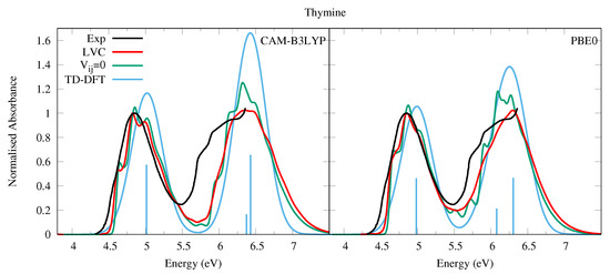 We did not succeed in finding in the literature a sufficiently well-resolved absorption spectrum in the gas phase (and covering the entire 200–300 nm region) of Thy, therefore instead in Figure 3 we present that of 1-methylthymine taken at a temperature of 369 K [52]. This is very similar to that of Ura, but for a weak red-shift, and a slightly closer spacing of the high and low energy bands. In methylcyclohexane two bands of similar intensity peaking at ∼4.7 and ∼6.0 eV are observed [54]. The simulated spectra for Thy are very similar to the experimental one and the conclusions of our analysis of Ura spectra are fully confirmed. The LVC spectra, which are in good quantitative agreement with experiments, are red-shifted and significantly broader than that obtained by convolution of the stick transitions. Moreover, the vibronic contributions explain the weak shoulder observed in the experiment at ∼4.7 eV assigning it to the 0-0 vibronic transition.