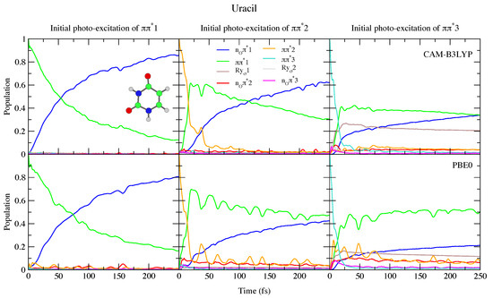 To the best of our knowledge the dynamics following individual excitation to and diabatic states, i.e., covering all the photoexcited population of the two lowest energy absorption bands, has never been investigated by calculations. Our simulations indicate that in both cases ∼50% of the population is transferred to within 25 fs. Then the systems proceed as described above after excitation to , with a large population transfer to n. However, in these cases, after 250 fs is still significantly populated, especially according to PBE0 and after excitation to , with the population ∼40% for Ura and ∼25% for Thy in this case. Furthermore, for initial excitation to 3, the lowest lying Rydberg state and, for PBE0 the n2 state, are somewhat populated after 250 fs. They are not predicted to play as large a role in the dynamics initiated on 2, and the higher lying Rydberg and n3 states are not predicted to play a significant role in any of the calculations.