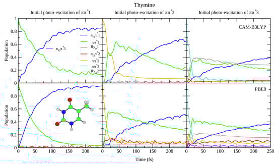 - Asturiol, D.; Lasorne, B.; Robb, M.A.; Blancafort, L. Photophysics of the ππ* and nπ* States of Thymine: MS-CASPT2 Minimum-Energy Paths and CASSCF on-the-Fly Dynamics. J. Phys. Chem. A 2009, 113, 10211–10218. [Google Scholar] [CrossRef]