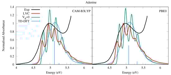 The absorption spectra obtained by the LVC Hamiltonian are similar for both CAM-B3LYP and PBE0 parameterised models, shown in Figure 7. They are dominated by the absorption of the L state (see also Figure S24 in the SI where the individual contributions of each state are shown), and show an appreciable amount of vibronic resolution. Contrastingly, the experimental absorption spectrum of Ade in the vapor phase (at 500 K) exhibits a structureless band peaking at ∼5 eV, with a long red-wing tail [52].