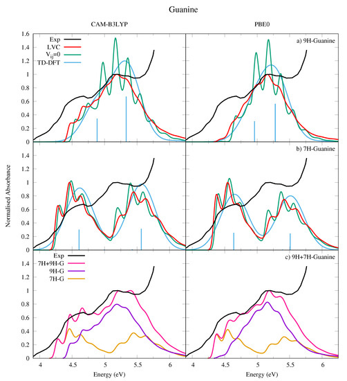 We have computed the absorption spectra for both 9H-Gua in Figure 9a and 7H-Gua in Figure 9b, where they are compared to an experimental spectrum measured in a nitrogen matrix at 15 K [53]. We also report in Figure 9c a spectrum computed with the hypothesis that in the experimental conditions the population of 9H and 7H tautomers is exactly the same. Considering that the two tautomers are practically isoenergetic, it is not easy to estimate the tautomeric ratio in the nitrogen matrix, as it was prepared by directly subliming solid Gua into the matrix.