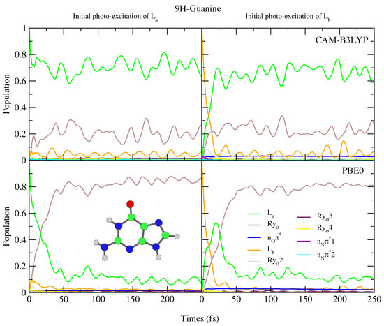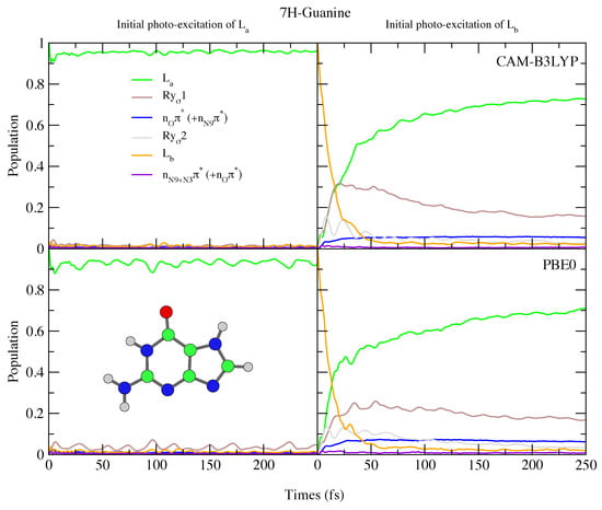 Since in 7H-Gua L is red-shifted and the Rydberg state blue-shifted with respect to 9H-Gua, we predict that the Rydberg state is much less involved in the excited state dynamics. It is only ∼20% populated after initial excitation to L, for both CAM-B3LYP and PBE0 models. Compared to Ade, there are also significant differences, with no involvement of the n states predicted for both 9H-Gua and 7H-Gua, in agreement with previous dynamics studies of 9H-Gua [95,96].