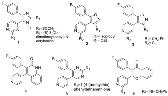 Several selective stilbene-based p38 inhibitors, where the vicinal 4-fluorophenyl/pyridinyl motif is inserted into different ring scaffolds, have been developed, such as five-membered pyrazoles ((Figure 2 (1)) [56,57], isoxazoles (Figure 2 (2)) [58,59], triazoles (Figure 2 (3)) [60,61,62,63], and six-membered quinolinones (Figure 2 (4)) [64,65], pyrimidines (Figure 2 (5)) [66], and chromones (Figure 2 (6)) [67]. Many of these compounds have been shown to be highly potent and able to inhibit the p38α kinase activity at nanomolar concentrations (Figure 2).