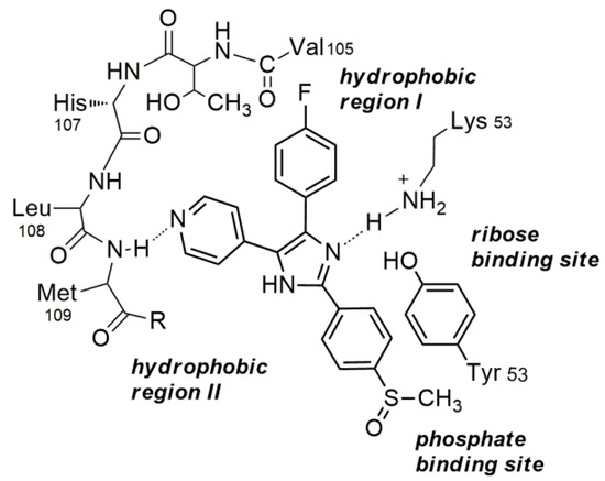Crystallographic data indicate that the interaction of SB 203,580 withthe ATP pocket of the p38 kinase involves the formation of a hydrogen bonding by the pyridine nitrogen atom with the backbone NH of Met109 in the hinge region. Furthermore, the interaction with the enzyme is further stabilized by hydrophobic interactions originated by the 4-fluorophenyl ring of the inhibitor which occupies the “hydrophobic pocket I” (HPI). Additional ligand-p38R interactions can be detected such as hydrogen bonding toward the core system from Lys53 and Tyr35 π-π stacking with the phenyl system. The binding mode of SB 203,580 shows that the ligand is not interfering with “hydrophobic region II” [57,66]. Thus, optimization of inhibitors to address HRII, which could be accomplished successfully mainly by introducing lipophilic substituents in the core system, appears to be a possible valuable improvement in the design of new inhibitors.