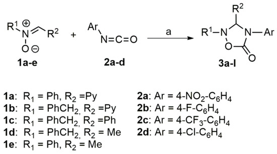 The synthetic approach towards the differently substituted 1,2,4-oxazolidinyl-5-ones (azastilbenes) 3a–l exploits a recently reported route [69] based on the 1,3-dipolar cycloaddition of nitrones 1a–e to isocyanates as dipolarophiles. Isocyanates 2a–d were reacted at room temperature in dry acetone and in a nitrogen atmosphere with nitrones 1a–e, obtained by the reaction of the corresponding aldehydes with N-methyl or N-aryl hydroxylamine [70,71,72,73], leading to the expected cycloadducts 3a–l in good yields (Figure 5; Table 1).