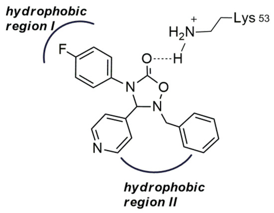 According to these considerations, our design has been addressed to the construction of a new series of novel potential inhibitors of MAPK3, in which two vicinal aromatic systems at C-3 and N-2 are connected to a 1,2,4-oxadiazole-5-one system. The heterocyclic ring assures the required correct spatial assessment of two vicinal aryl groups, while the stabilizing hydrogen bond interactions to the hinge region and Lys53 of the enzyme pocket are mimed by the nitrogen atom of the pyridinyl unit at C-3 and by the oxygen atom of the carbonyl group, respectively (Figure 3). Moreover, important hydrophobic interactions can be exerted by the aryl groups present at position 2: the aromatic system was supposed to be orientated to afford further consistent lipophilic interactions to HRII and to provide options for further structural modifications.