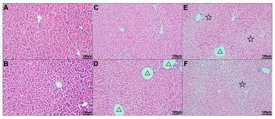 The hepatic lobules of the mice in the control group were clearly structured, the hepatic cords and sinuses were arranged neatly and the structure of hepatocytes was completed (Figure 1A,B). In the low-dose group, the structure of hepatic lobule and the arrangement of hepatic cord were clear, the central vein of hepatic lobule was slightly dilated and the venous lumen of the portal area was also dilated slightly (△) (Figure 1C,D). In the high-dose group, the central lobule veins were slightly dilated (△) and the hepatocytes around the central lobule vein showed hypertrophy and vacuolar degeneration with unclear cell boundaries (☆) (Figure 1E,F).