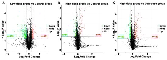 The volcano plots of differentially expressed proteins (DEPs) between different groups. (A) low-dose group vs. control group. (B) high-dose group vs. control group; (C) high-dose vs. low-dose group. Significant difference for the p value on vertical ordinate (Base 10 logarithmic transformation). Red dots represent up-regulated; green dots represent down-regulated; black dots represent no significant difference.