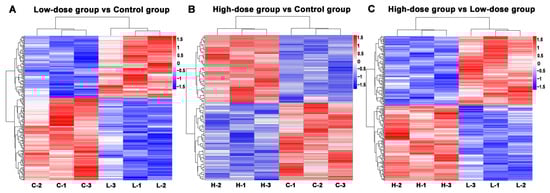 The heatmaps of differentially expressed proteins (DEPs) between different groups. (A) low-dose group vs. control group. (B) high-dose group vs. control group; (C) high-dose vs. low-dose group. Red represents up-regulation and blue represents down-regulation.