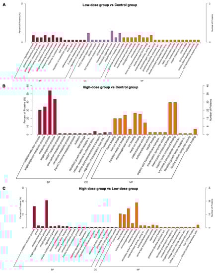 Functional enrichment of Gene Ontology (GO) annotation (Top 20) for differentially expressed proteins (DEPs). (A) low-dose group vs. control group. (B) high-dose group vs. control group; (C) high-dose vs. low-dose group. BP: biological Process, CC: Cellular Component, MF: Molecular Function. The left ordinate represents the number of detected differential proteins associated with the GO as a percentage of the number of differential proteins annotated by GO and the right ordinate represents the number of detected differential proteins associated with the GO.