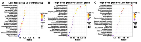 The KEGG pathway enrichment analysis of different groups. (A) low-dose group vs. control group. (B) high-dose group vs. control group; (C) high-dose vs. low-dose group. The abscissa represents the ratio of the number of differential proteins associated with the pathway to the number of background (all) proteins associated with the pathway. The redder the bubble represents the smaller the p value, the bluer the bubble represents the larger the p value and the larger the bubble represents the more differential proteins detected.