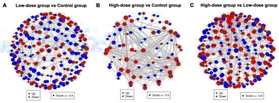 PPI networks of differentially expressed proteins (DEPs) between different groups. (A) low-dose group vs. control group. (B) high-dose group vs. control group; (C) high-dose vs. low-dose group. Red nodes represent up-regulated proteins and blue nodes represent down-regulated proteins.
