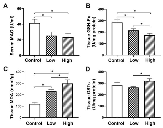 GSH-Px, MDA, GSTs and MAO levels were presented as means ± standard deviation (SD) and analyzed using IBM SPSS Statistics for Macintosh, Version 26.0 (SPSS Inc., Chicago, IL, USA). One-way analysis of variance (ANOVA) was used when appropriate and a post hoc analysis was performed if a significant difference was determined. p < 0.05 was considered statistically significant.