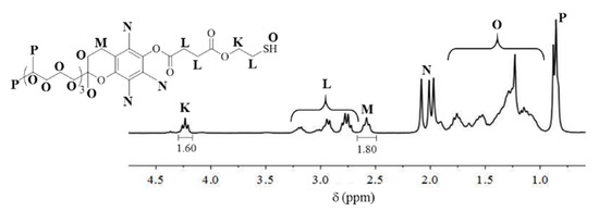 After filtration to remove the dicyclohexylurea formed by the hydration of DCC, the organic solution was washed with different aqueous solutions: (i) HCl 0.05 M, (ii) saturated NaHCO3 and (iii) water and then dried on Na2SO4. The esterification reaction was confirmed by proton nuclear magnetic resonance (1H NMR) spectroscopy (Figure 1). The comparison of the protons of the -O-CH2-ester (peak K) to the signal of the -CH2- of the tocopherol part (peak M) allows the determination of the reaction yield, which reached 88%. With both thiols in hands, the post-polymerization thiol-ene reaction onto the PEG-b-PPE copolymers can be studied.