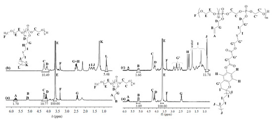 1H NMR spectra in CDCl3 of (a) PEG-b-PBenEP, (b) PEG-b-P(DodecS-BEP and (c) PEG-b-P(TocoS-BEP).