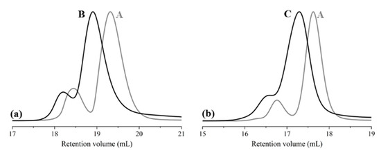 SEC traces in THF of (a) PEG-b-PBenEP (A), PEG-b-PDodecS-BEP (B) (0.7 mL/min) and (b) PEG-b-PBenEP (A), PEG-b-PTocoS-BEP(C) (1 mL/min).