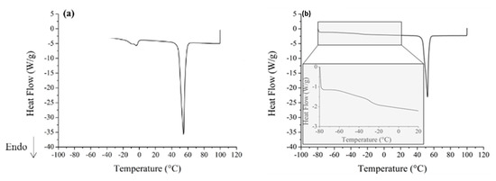 DSC curves under dynamic nitrogen atmosphere (50 mL min−1) with a temperature ramp of 10 °C min−1 between −80 °C to 100 °C for (a) PEG-b-PdodecS-BEP block copolymer and (b) PEG-b-PTocoS-BEP copolymer.