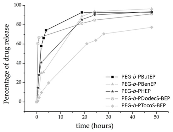 The ketoconazole release profiles from the various particles prepared by solvent evaporation are compared on Figure 6. In most cases, a fast release is observed whatever the copolymer, about 80% or more of the loaded content is released after 20 h. In contrast, a slower release without Burst effect is observed in the case of PEG-b-PTocoS-BEP micelles. Indeed, these micelles released only 9% during the first three hours. After these three first hours, the ketoconazole release rate is very similar to obtain a percentage of release of about 60% after 20 h and 75% after 48 h, i.e., significantly slower than the release rates recorded for the other PPE-based micelles.