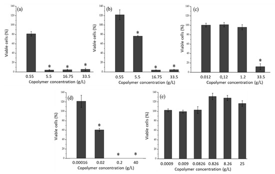 Cell viability of HUVEC cells against (a) PEG-b-PButEP, (b) PEG-b-PBenEP, (c) PEG-b-PHEP, (d) PEG-b-PDodecS-BEP and (e) PEG-b-PTocoS-BEP after incubated for 24 h with different copolymer concentration solutions determined by live/dead cell viability assay. Errors bars represent the s.d. and * = p < 0.05 (compared to control).