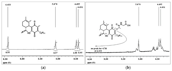 1H-NMR analysis of MPG binding to HU-331: (a) expansion of region 4–6.5 ppm of HU-331 H1-NMR; (b) expansion of region 4–6.5 ppm of HU-331 1H-NMR after the addition of MPG.