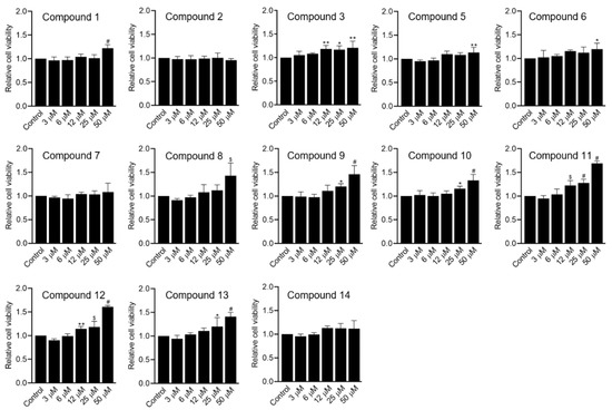 Effect of the isolated compounds on the viability of tBHP-damaged ADMSCs, evaluated by a CCK-8 assay (n = 5). ADMSCs were treated with a medium containing 100 µM tBHP and the isolated compounds at various concentrations. Cells only treated with 100 µM tBHP were used as controls. The cell viability test was performed at 24 h after treatment. The data represent two independent experiments. * p < 0.05, ** p < 0.01, $ p < 0.001, # p < 0.0001.