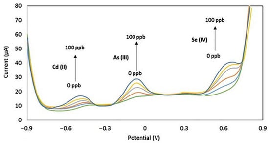 There is currently a growing need to monitor heavy metals in complex matrices that are involved in the food chain. Locatelli et al. in their work described the sequential detection of Cu(II), Pb(II), Cd(II) and Zn(II) by square-wave anodic stripping voltammetry, As(III) and Se(IV) using square-wave cathodic stripping voltammetry as well as Mn(II) and Fe(III) using square-wave voltammetry in whole grain, wheat and corn flour on HMDE in 0.5 mol L