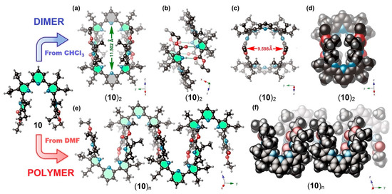 (a) Single crystal X-ray structures of receptor 10 grown from two different solvents under ambient conditions. Panels (a–d) represent a discrete supramolecular dimeric pseudo-macrocyclic cage-like structure of the receptor with the empirical chemical formula (10)2 grown from anhydrous CHCl3. (e,f) The single-crystal X-ray structure of receptor 10 represents a “zig-zag” 1D hydrogen-bonded supramolecular polymer with empirical chemical formula (10)n grown from anhydrous N,N-dimethylformamide (DMF). For clarity, the solvent molecules (CHCl3 and DMF) are omitted from the (10)2 and (10)n crystals, respectively.