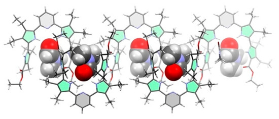 As mentioned earlier, receptor 10 preferentially self-assembles in the discrete dimeric form to produce a supramolecular pseudo-macrocyclic cage with the empirical chemical formula (10)2 when crystalized from a relatively less polar non-coordinating solvent, e.g., CHCl3 (Figure 2a–d). This produces a small rectangular inner cavity that is suitable for small acid guests. The “total potential solvent occupied void volume”, which was calculated using PLATON crystallographic software [33], was approximately 1632 Å3 (which is 30.9% per unit cell volume, 5289 Å3). The crystal packing diagram of (10)2 is shown in Figure S37a,b.
