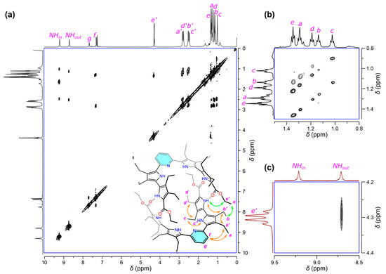 (a–c) 1H–1H NOESY spectrum of 10 in CDCl3 at 298 K. The inset shows the expected dimer structure with the specific interactions.