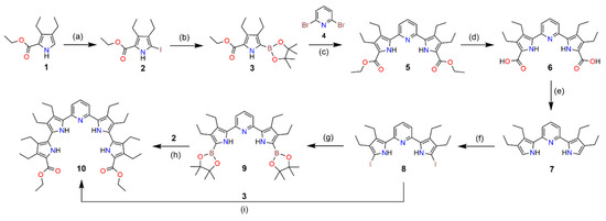 The acyclic receptor 10 was synthesized via a multistep process, which is described below in Scheme 1. Precursor 3 was synthesized using procedures from the literature [30,31]. Compound 5 was synthesized via a Pd(II)-acetate-catalyzed Suzuki–Miyaura cross-coupling reaction using commercially available 2,6-dibromo-pyridine [32]. Hydrolysis of compound 5 with NaOH solution was followed by the decarboxylation of compound 6 at both the terminal pyrroles to produce a highly reactive intermediate compound 7. Iodination of the terminal α-free pyrrole of 7 followed by a Pd(0)-catalyzed Suzuki–Miyaura cross-coupling reaction with compound 3 gave the desired final receptor 10 in moderate yield (58%). Additionally, compound 10 was prepared by Miyaura borylation of terminal iodo-pyrroles, followed by a Pd(0) cross-coupling reaction with precursor 2 with a similar isolated yield (55%). Compound 10 was characterized by 1H-, 13C-, and two-dimensional nuclear magnetic resonance (NMR) spectroscopic analyses (correlation spectroscopy (COSY) and nuclear overhauser effect spectroscopy (NOESY)) and mass spectrometry (Figures S9–S12 and S31).