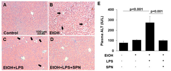 Spermidine prevents ethanol and LPS-induced liver injury. Thick (4–6 µm) sections from mouse livers treated in the absence (control) or presence of ethanol (EtOH), LPS and/or spermidine (SPN) as indicated were stained with hematoxylin and eosin using routine procedures (A–D). Arrows indicate lipid droplets (B,C) and areas of inflammatory cell infiltration (C) that are absent in sections from control (A) or spermidine-treated mice (D). Bar = 100 µm. (E) Plasma levels of ALT were determined in control or treated mice as indicated. For each experimental condition, four mice were anlayzed (n = 4). The values in E represent the means of triplicate experiments ± SE.