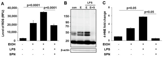 Spermidine prevents ethanol and LPS-induced oxidative stress. The levels of ROS were determined fluorometrically in livers from mice treated in the absence (control) or presence of ethanol (EtOH), LPS and/or spermidine (SPN) as indicated (A). Total 4-HNE protein adducts (B). Molecular weight markers are indicated on the left of the immunoblot in kDa. Densitometric comparison of the immunoreactive species was performed to determine relative levels of expression. Values were normalized to total β-actin levels and are plotted as fold-increase relative to control (C). A representative immunoblot is shown in (B). For each experimental condition, four mice were analyzed (n = 4). The values in (A,C) represent the means of triplicate experiments ± SE.