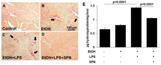 Spermidine prevents ethanol and and LPS-collagen deposition. Thick (4–6 µm) sections from mouse livers treated in the absence (control) or presence of ethanol (EtOH), LPS and/or spermidine (SPN) as indicated were stained with Sirius red to monitor collagen deposition (A–D). Labeling was only observed in sections from mice treated with ethanol alone or additionally treated with LPS (B,C). Bar = 100 µm Total hydroxyproline was detected colorimetrically from control or treated mice as an additional indicator of collagen deposition (E). For each experimental condition, four mice were analyzed (n = 4). Values are plotted as µg hydroxyproline detected per mg of liver. The values in E are means of triplicate experiments ± SE.
