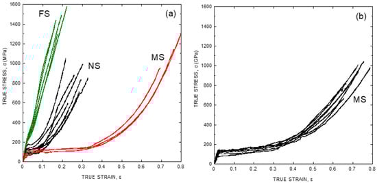 Characteristic tensile properties of spider silk expressed as true stress vs. true strain curves. (a) Tensile properties of spider silk spun by Argiope trifasciata spiders. FS: forcibly silked, NS: naturally spun, MS: maximum supercontracted. (b) Tensile properties of maximum supercontracted (MS) spider silk fibers spun by Argiope argentata spiders. The experimental details may be found in the corresponding references by the authors cited in the main text.