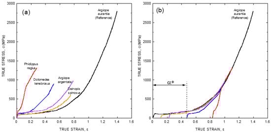 (a) Comparison of true stress-true strain curves of fibers spun by different spiders species of the Entelegynae suborder after being subjected to maximum supercontraction (MS curves). (b) Definition of the α* parameter by displacing the true stress-true strain curves of the maximum supercontracted fibers along the true strain axis (X-axis) so that it concurs with the Argiope aurantia MS curve used as reference at high values of true strain. The experimental details may be found in the corresponding references by the authors cited in the main text.
