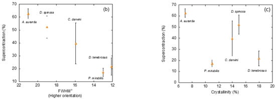 (a) X ray diffraction patterns of individual spider silk fibers of selected representatives of the Entelegynae suborder after being subjected to maximum supercontraction. (b) Relationship between the extent of supercontraction and the orientation of the nanocrystals with respect to the macroscopic axis of the fiber (measured as the full width at half maximum (FWHM) of the diffraction spot along the azimuthal direction) for the different species. (c) Relationship between the extent of supercontraction and the crystallinity of the fibers for the different species. The experimental details may be found in the corresponding references by the authors cited in the main text.