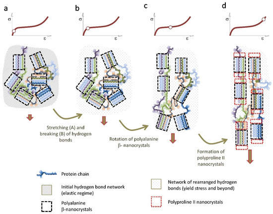 Scheme of the proposed deformation micromechanisms of the Entelegynae major ampullate gland silk fibers. The hydrogen bonds are stretched in the elastic regime (a) and begin to break upon reaching the yield stress (b). The breaking of the initial network of hydrogen bonds is followed by the rotation of the polyalanine β-nanocrytals that tends to get oriented with the macroscopic axis of the fiber (c) When the maximum possible orientation of the polyalanine β-nanocrystals is attained, polyproline II nanocrystals start to form at the ends of the β-nanocrystals (d).