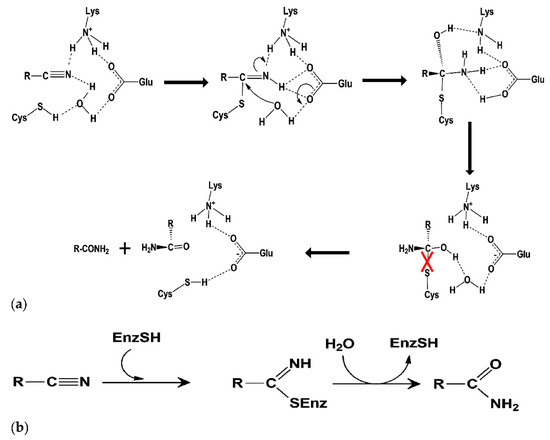 One of the most important emerging tools that use genomic, transcriptomic, and proteomic techniques to study biodegradation of cyanurated wastes is Cyan-omics. This tool uses genome analysis of cyanide-degrading microorganisms to provide information on the metabolic maps of organisms and makes it possible to investigate bioremediation in industrial wastewaters. Thus, using this tool for studying and identifying cyanotrophic microorganisms and comparing genes that are involved in cyanide detoxification demonstrates a new way to extend our knowledge on cyanide biodegradation pathways [10]. Recently, metagenomics was applied for the genomic analysis of a cyanide-degrading population of uncultured microorganisms [10,11]. Due to the increasing demand for cyanide-rich waste degradation, the genetic modification of Trichoderma spp. for an increased rhodanese and cyanide hydratase activity has been performed for cyanide bioremediation [6]. The amino acid sequence of cyanide dihydratase in Flavobacterium indicum MTCC6936 has 50% and 43% sequence identity with the putative amino acid sequence of F. indicum and cyanide dihydratase isolated from Bacillus pumilus respectively, and its catalytic triad was Glu at 46, Lys at 130, and Cys at 164th position [12]. Cyanide hydratase is one of the nitrilase superfamily proteins and the structure of these proteins have an active site with a triad of residues, Glu-Lys-Cys, which is essential for their function and enhances the performance of proteins [13]. The mutation of any residue of this triad will result in loss of function in this protein family [14]. The reaction of the nitrile and cyanide degradation in the nitrilase superfamily takes place via the formation of a tetrahedral intermediate in the active site. The tetrahedral intermediate can be hydrolyzed using the active site of cyanide hydratase and its pathway eliminates the formal thiol of Cys to produce an amide, and Glu is likely to be the proton provider (Figure 1) [15]. All of the cyanide degradation reactions are initiated by a nucleophilic attack using the active site cysteine residue on the cyano or carbonyl carbon atom. The glutamate in the catalytic triad is likely to play the role of a catalytic base, while the lysine provides electrostatic stabilization as a part of the nitrilase equivalent of the oxyanion hole [16].