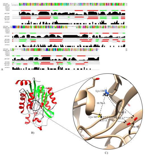 (A) CHT and Nit6803 and alignment of their secondary structural elements. (B) Tertiary structure of cyanide hydratase model, and (C) its catalytic triad predicted by Chimera software [24].