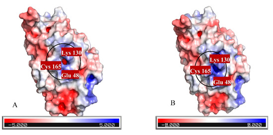 Electrostatic potential molecular surface of (A) wild-type and (B) mutant proteins.