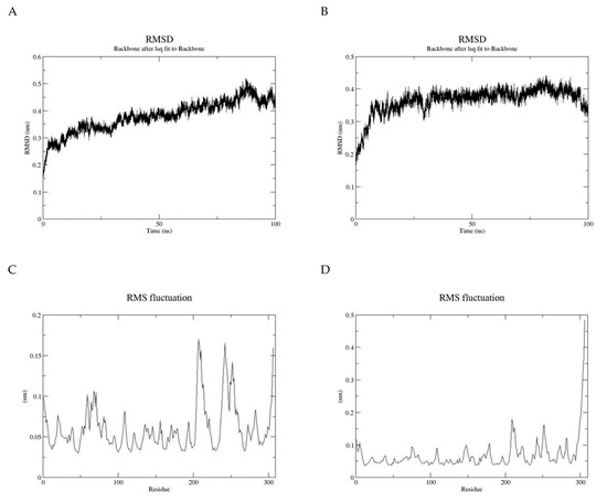 Molecular dynamics (MD) simulation was applied to examine the stability of the protein–ligand complex in GROMACS suite [50]. Both of the models, CHT and mCHT, were simulated in the presence or absence of the ligand, in two separate runs. Afterward, GROMOSE 54A7 forcefield [51] was used to create proper topologies. The models were placed at the center of a dodecahedral box and solvated with the TIP3P water model, while Cl− or Na+ ions were used for the neutralization of each system. The energy of the system was minimized with the steepest descent method to eliminate possible clashes and bad contacts. Subsequently, the equilibrations of systems were done under NVT up to 100 ps at 300 K with restraint forces of 1000 kJ/mol, followed by 100 ps under NPT at the pressure of 1 bar, and with restraint forces of 1000 kJ/mol. The electrostatic interactions were calculated using the Particle Mesh Ewald (PME) method [52]. Finally, a 100 ns MD run with no restraint was performed for evaluating the systems’ stability. The root-mean-square fluctuations (RMSFs) and the root-mean-square deviations (RMSDs) were analyzed for the wild-type enzyme and its mutant in the MD simulation [53].
