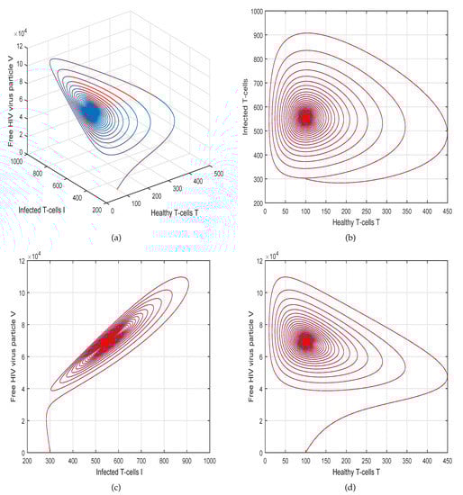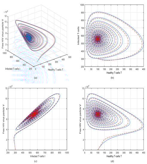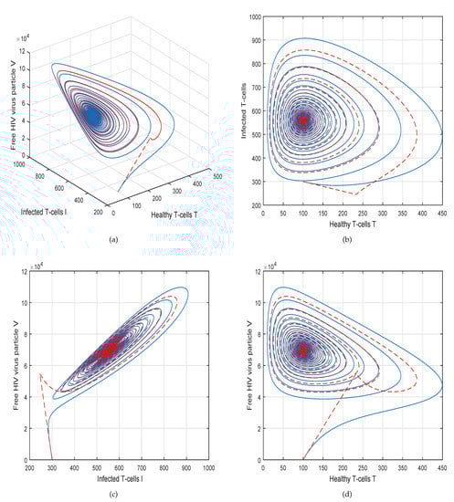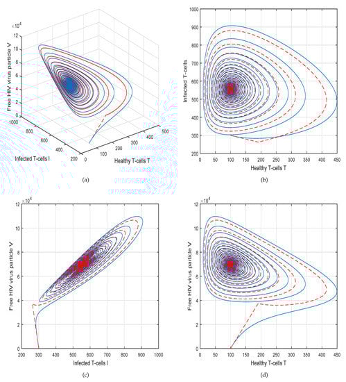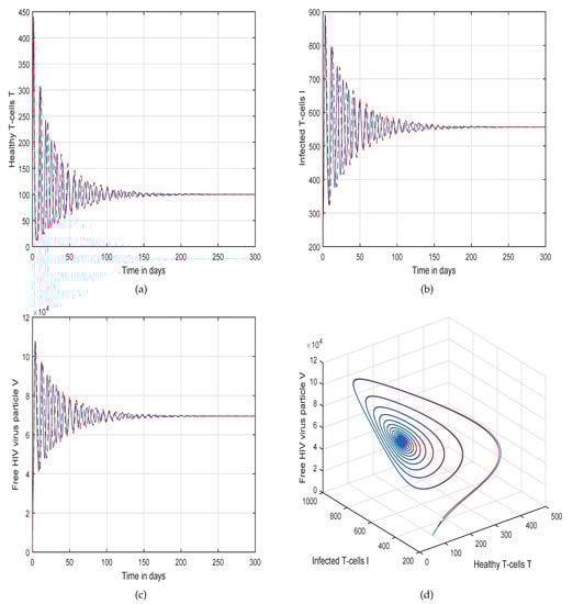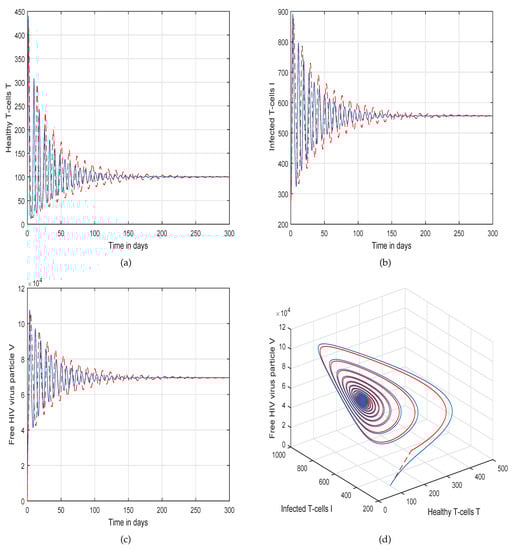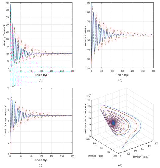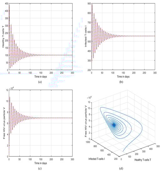 Mathematical biology has a wide range of applications in genetics, environmental sciences, population dynamics, medical sciences, etc. The field may be expressed as biomathematics depending on whether dealing with mathematical aspects or biological aspects []. Several biological phenomena and processes can be formulating in the language of mathematics in the framework of ordinary differential equations, fractional differential equations, impulsive differential equations, stochastic differential equations, delay differential equations, etc. [,,,,]. Different assumptions, laws, axioms governing these processes are used in the formulation of these mathematical models to show the intricate dynamics of biological phenomena. Presently, the most critical and dangerous global health issue is human immunodeficiency virus (HIV), and numerous mathematical models have been developed of the human immune system to highlight the overall picture of the infection that describes the infection of HIV and its interaction with the immune system. It is reported that HIV is the causative agent for obtaining acquired immune deficiency syndrome (AIDS), which damages the body’s ability to fight other infections. HIV is an incurable deadly disease, and millions of people have lost their lives from it. However, people are living long and healthy lives with HIV due to effective HIV treatment, care, diagnosis, and prevention. When HIV enters the body of a healthy individual, it quickly reproduces and damages the T-cells, which affects the immune system. The symptoms in the primary stage of HIV are fever, night sweats, cough, weight loss, headache, diarrhea, rash, joint pain and muscle aches, swollen lymph glands, and sore throat. At this stage the load of viruses in the blood is high, and infection easily spreads in the body compared to other forthcoming stages. Furthermore, HIV infects via bodily fluids (blood, tears, urine, spit, etc.).