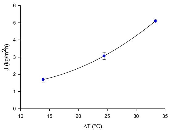 Permeate flux as a function of thermal gradient. Feed, distilled water; Qfeed, 150 L/h; Qp, 80 L/h; Tp, 10.2 °C.