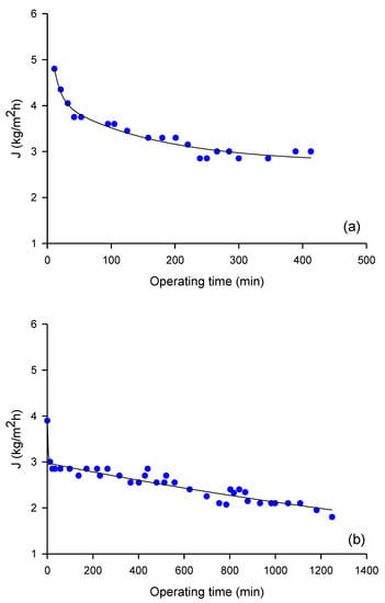 The membrane productivity measured in DCMD experiments performed with microfiltered OMW under a thermal gradient of 30 °C is illustrated in Figure 2. In particular, Figure 2a shows the time course of the permeate flux measured in DCMD experiments, performed under the selected operating conditions up to a weight reduction factor (WRF) of 3.57. The evaporation flux decreased from 4.8 to 3.0 kg/m2h after 6.8 h of microfiltered OMW processing, which means a decrease of 37.5%. In Figure 2b the evaporation flux measured in the same operating conditions, up to a WRF of 5.71, is shown; in this case the evaporation flux decreased from 3.9 to 1.8 kg/m2h after 20.8 h of processing, with a decrease of 54% in comparison to the initial value. The decrease of evaporation flux observed in both cases can be attributed to the increase of the feed concentration, polarization concentration effects, and membrane fouling phenomenon [].