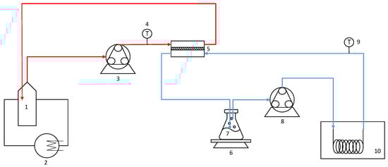 DCMD experiments were performed by using the experimental setup, schematically depicted in Figure 3. It was equipped with a membrane cell consisting of two compartments—the feed side and the permeate side. The module was positioned horizontally so that the feed solution flowed through the bottom compartment of the cell while the cooling water passed through the upper compartment. An external cooling bath was used for the regulation of the cold stream (permeate) temperature, while a thermostatic bath was used for the regulation of the feed stream (microfiltered OMW) temperature.