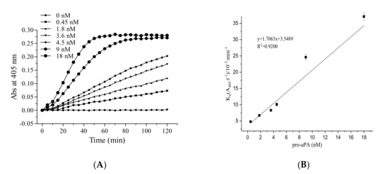 The reaction mixture contained pro-uPA (0.45, 1.8, 3.6, 4.5, 9.0, and 18 nM), Glu-plasminogen (40 nM), FGFC1 (0.048 mM), S-2444 (0.4 mM), BSA (10 mg/mL), and Tris-HCl buffer (50 mM, 100 mM NaCl, pH 7.4 at 25 °C). The reaction mixture was measured in a 96-well plate at 37 °C for 120 min. The time–absorbance curves were determined at 405 nm using a microplate reader. The fibrinolytic activity of different pro-uPA concentrations was obtained from the time–absorbance curves.
