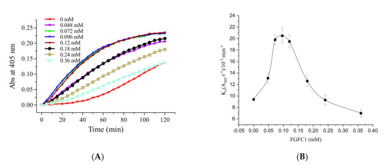 As shown in Figure 3, at concentrations of FGFC1 up to 0.24 mM, FGFC1 promoted fibrinolytic activity; however, any further increase in concentration had no effect. In particular, when the FGFC1 concentration was below 0.096 mM, fibrinolytic activity was enhanced by FGFC1 in a dose-dependent manner. From 0.096 to 0.24 mM, the promoting effect of FGFC1 declined in a dose-dependent manner. The fibrinolytic activity reached its maximum and showed a 2.2-fold enhancement at 0.096 mM (Figure 3B).